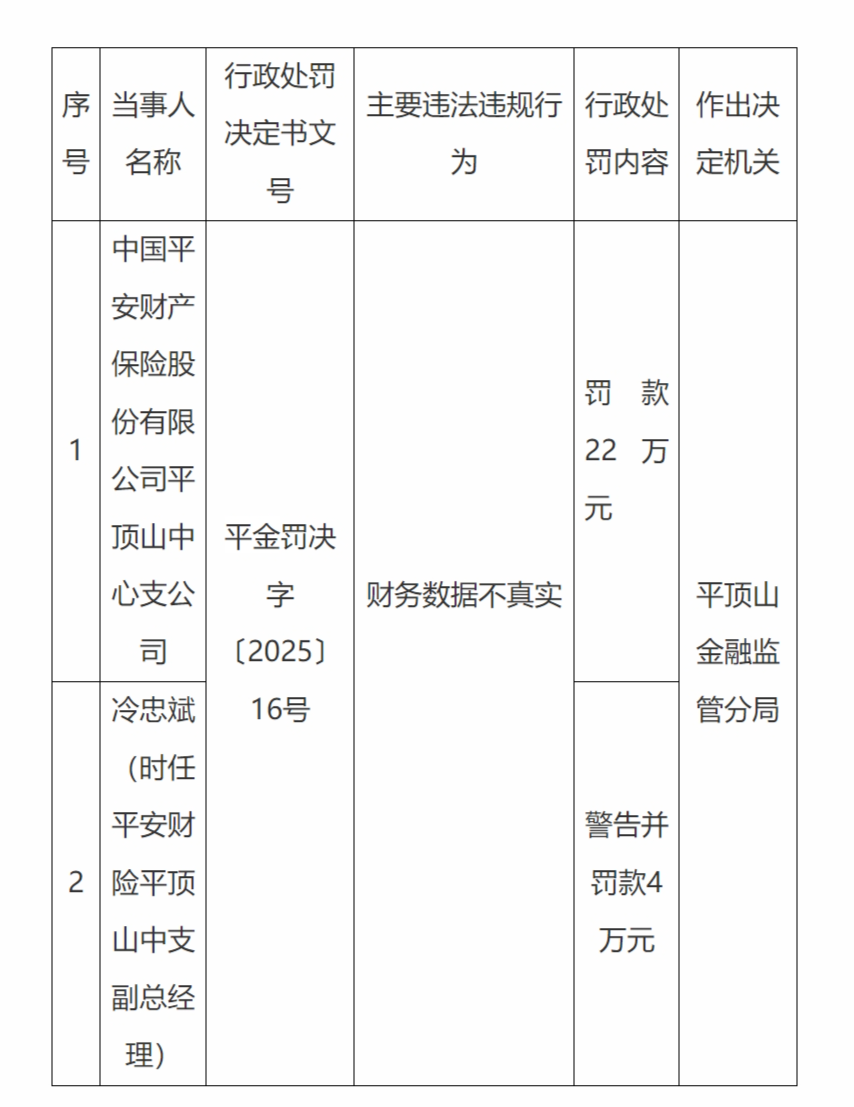 12月26日,国家金融监督管理总局平顶山监管分局行政处罚信息公示表显示,中国平安财产保险股份有限公司平顶山中心支公司,财务数据不真实,被罚款22万元;冷忠斌(时任平安财险平顶山中支副总经理)配资最良心10大平台,警告并罚款4万元。