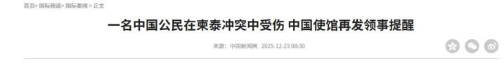 12月23日,中国驻柬埔寨大使馆正式发布紧急警告,明确披露12月22日柬埔寨马德望省有一名中国公民在柬泰边境冲突的炮火波及下受了轻微伤。中国驻柬埔寨大使馆第一时间通过当事人所属企业核实了情况,并向伤者表达了慰问。