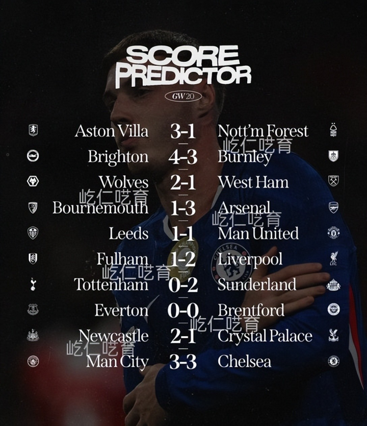 北京时间1月3日20:30、即26年的第一个周末可靠的配资门户,英超联赛将会在本周上演的是联赛第20轮的较量。而在赛前,从Sports Illustrated FC(美国体育媒体《体育画报》旗下的足球内容平台,主要提供英超、欧冠等赛事的新闻、转会动态、赛前预测及数据分析)也按照惯例发布了对于本轮英超10场比赛的比分预测。